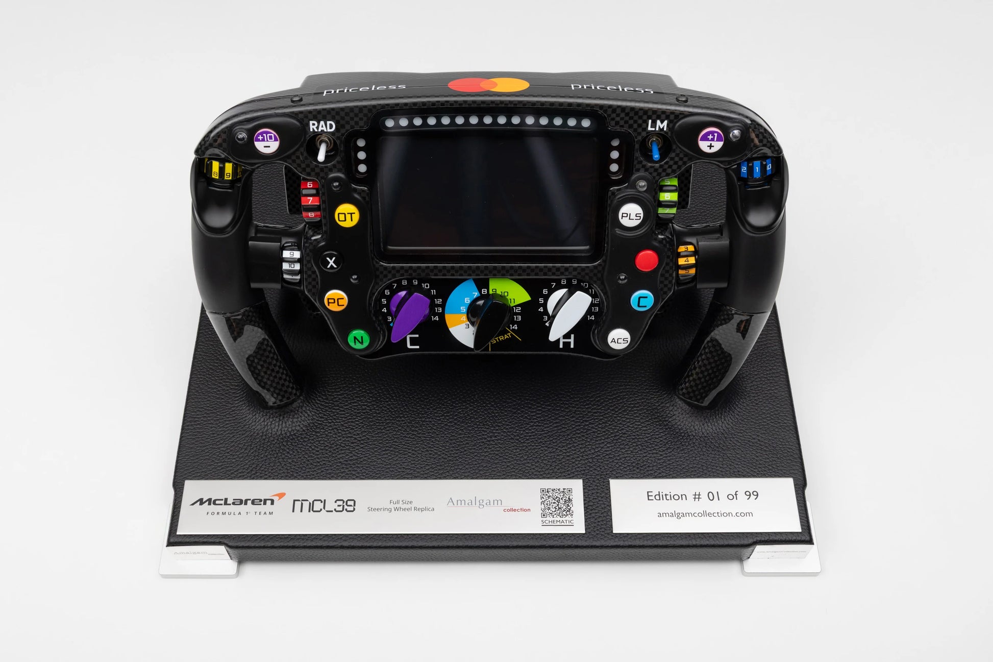 - Basado en el volante usado por Lando Norris y Oscar Piastri durante la temporada 2024 del Campeonato Mundial de Fórmula Uno de la FIA